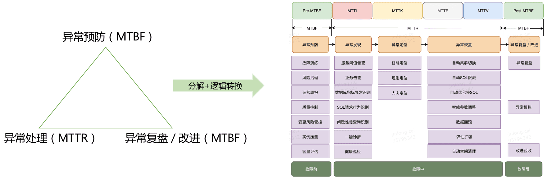 我们复盘了过去一段时间内的故障和告警,深入分析了这些问题的根因,发现任何一个异常其实都可以按时间拆分为异常预防、异常处理和异常复盘三阶段。针对这三阶段,结合MTTR的定义,然后调研了美团内部及业界的解决方案,我们做了一张涵盖数据库异常处理方案的全景图。如下图所示: