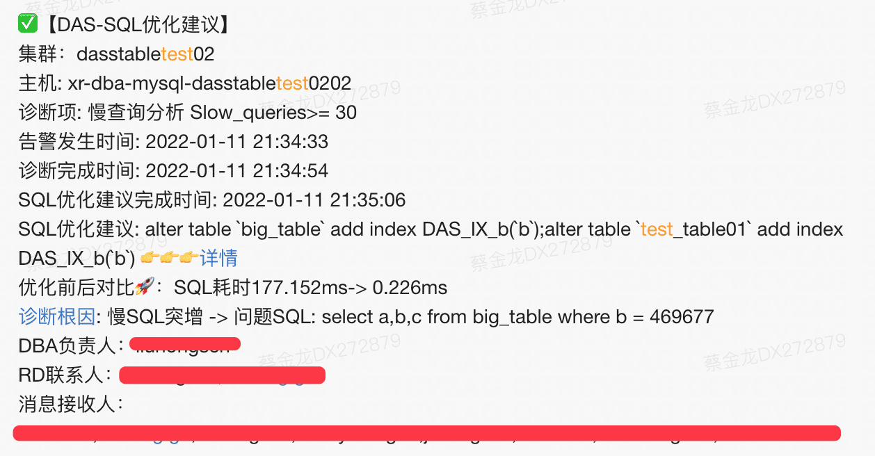 以下是出现Load告警后,我们的一个慢查询优化建议推送案例(脱敏原因,采用了测试环境模拟的案例)。
