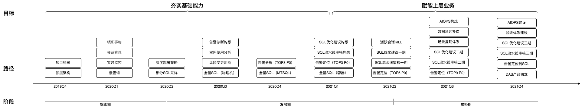 有了明确的指导思想,我们该采取怎样的发展策略和路径呢?就当时团队的人力情况来看,没有同学有过类似异常自治的开发经验,甚至对数据库的异常分析的能力都还不具备,人才结构不能满足产品的终极目标。所谓“天下大事必作于细,天下难事必作于易”。我们思路是从小功能和容易的地方入手,先完指标监控、慢查询、活跃会话这些简单的功能,再逐步深入到全量SQL、异常根因分析和慢查询优化建议等这些复杂的功能,通过这些基础工作来“借假修真”,不断提升团队攻坚克难的能力,同时也可以为智能化打下一个良好的基础。
