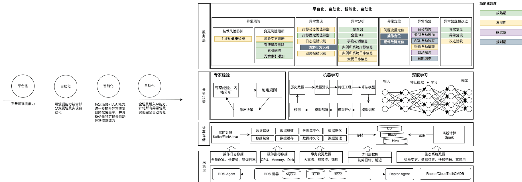 首先,我们要完善可观测的能力,通过关键信息的展示,构建一个易用的数据库监控平台。然后我们根据这些关键信息为变更(比如数据变更和索引变更等)提供赋能,将一部分高频运维工作通过这些结构化的关键信息(比如索引变更,可以监测近期是否有访问流量,来确保变更安全性)让用户自主决策,也就是自助化。接下来,我们加入一些智能的元素(专家经验+AI),进一步覆盖自助化的场景,并逐步将部分低风险的功能自动化,最终通过系统的不断完善,走到高级或完全自动化的阶段。
