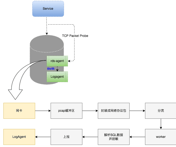 从调研上我们可以看到,基于pf_ring和dpdk的方案都有较大的依赖性,短期难以实现,之前也没有经验。但是,基于pcap的方式没有依赖,我们也有过一定的经验,之前美团酒旅团队基于抓包的方式做过全量SQL数据采集的工具,并经过了1年时间的验证。因此,我们最终采取了基于pcap抓包方式的技术方案。以下是采集层方案的架构图和采集质量以及对数据库性能带来的影响情况。